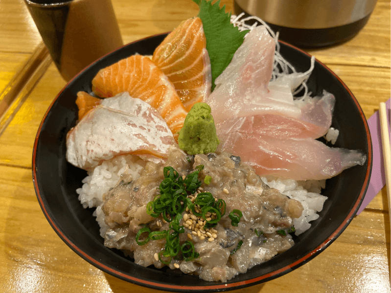 沼津港で海鮮丼 魚河岸海鮮丼 イクラ付き生しらす丼 まかない丼 沼津港さかなや千本一 かもめ丸